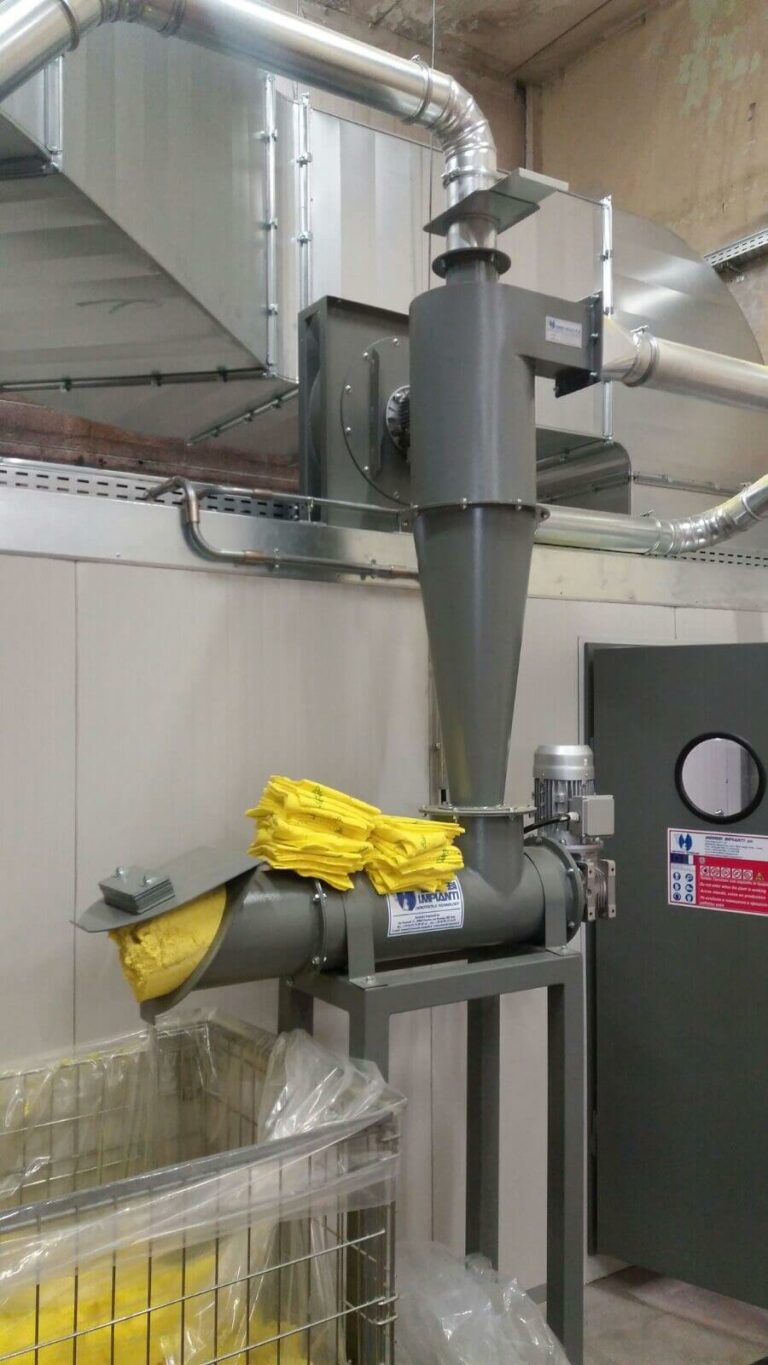 The CVC Cyclone is a machine designed for dust treatment and collection. It consists of a metal structure and a compacting screw that rotates by means of a gear motor. The dusty air enters tangentially into the upper part of the machine and, due to the cyclonic effect, is stripped of dust and conveyed to the outlet located on the head of the machine. The dust is collected inside the screw conveyor which, rotating on itself, presses and compacts the dust, gradually reducing its volume.
