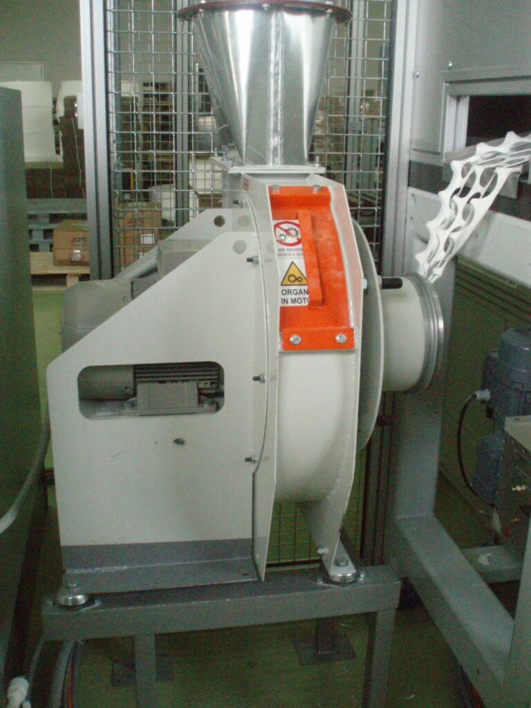 Esso è una macchina studiata per l’aspirazione di aria e lo sminuzzamento di vari tipi di materiale. È costituito da una robusta struttura metallica saldata, una girante bilanciata dinamicamente e completa di lame e un motore direttamente accoppiato. Viene generalmente installata a corredo delle linee di produzione per l’aspirazione del materiale di scarto che, grazie ai coltelli installati sulla girante, viene triturato e spedito ad un sistema di raccolta.  Il boccaglio dentato di ingresso aria è decentrato rispetto all’asse della girante ed è regolabile per adeguarsi al meglio al tipo di materiale, controllare la dimensione degli sfridi e il loro grado di apertura.